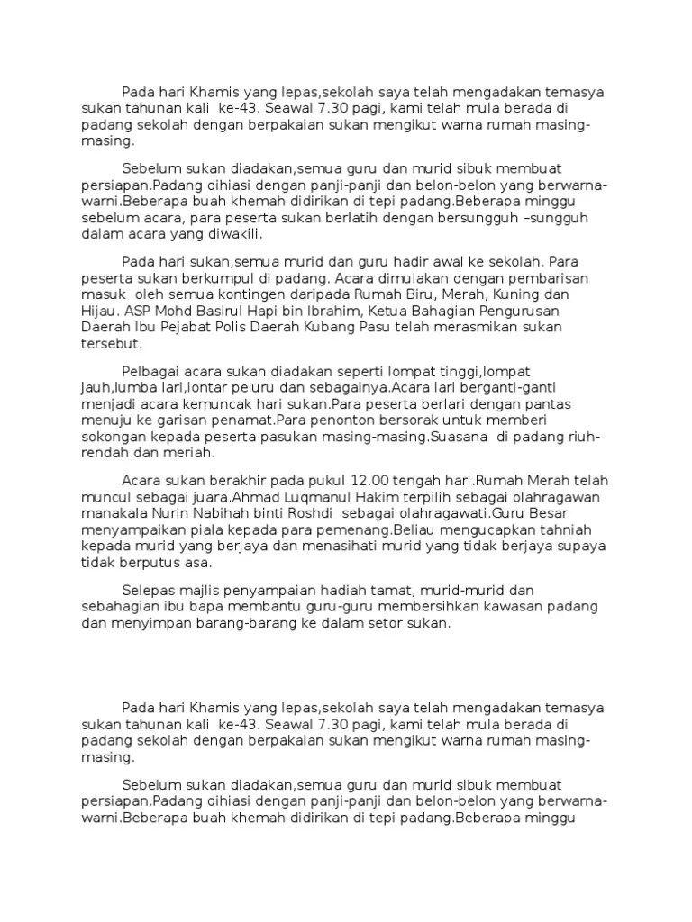 Ia diadakan di padang tan . Laporan hari sukan di kolej vokasional kuala krai. Contoh laporan berformat format karangan jenis laporan karangan jenis ini menghendaki anda melaporkan sesuatu peristiwa yang didengar. Laporan hari sukan negara peringkat sekolah 2016 tarikh : Sekolah.hari sukan bermula pada pukul 8:00 pagi.hari sukan diadakan di padang . Pada cuti penggal kedua yang lalu, .